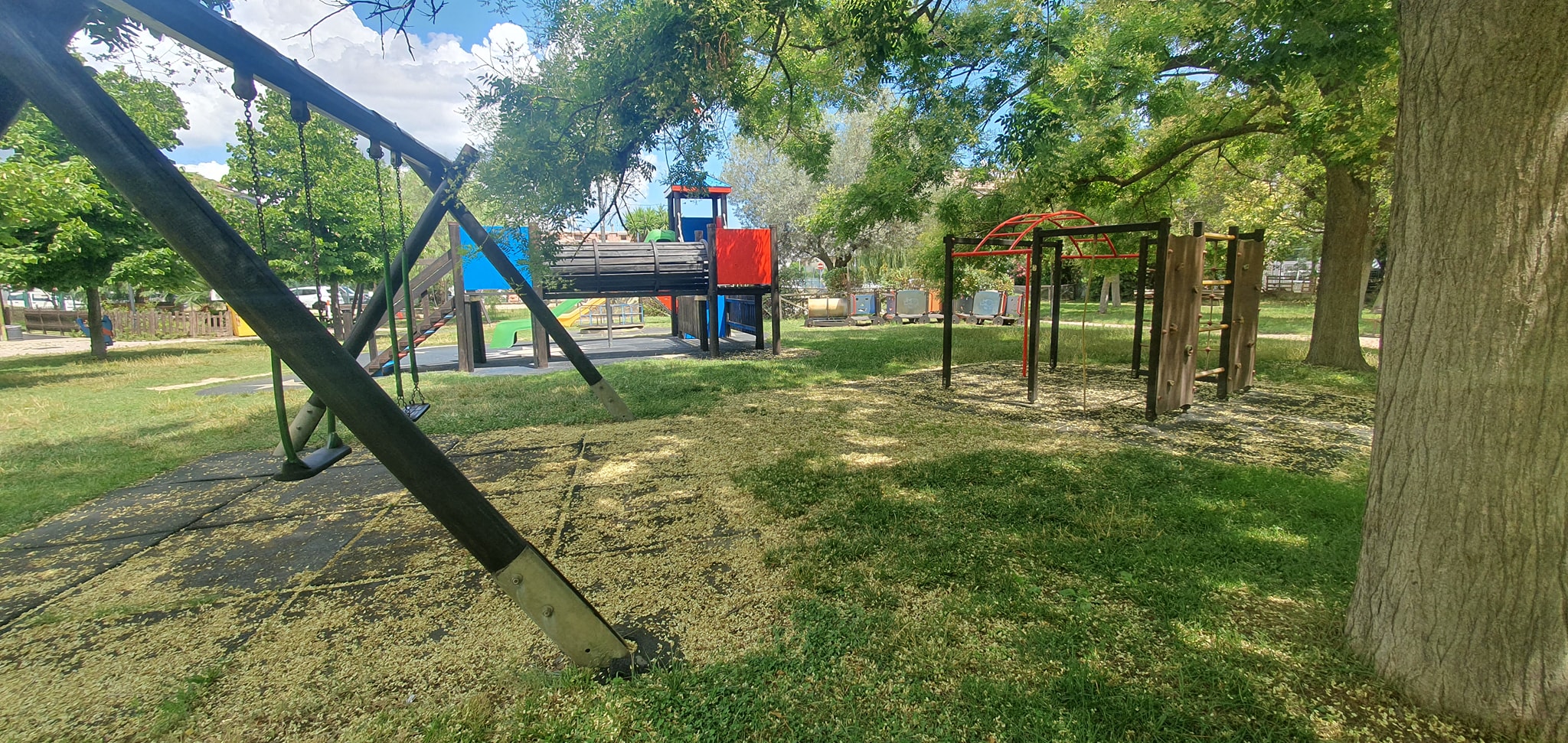 Area ludica per bambini, completa di giochi a molla, scivoli e altalene.
